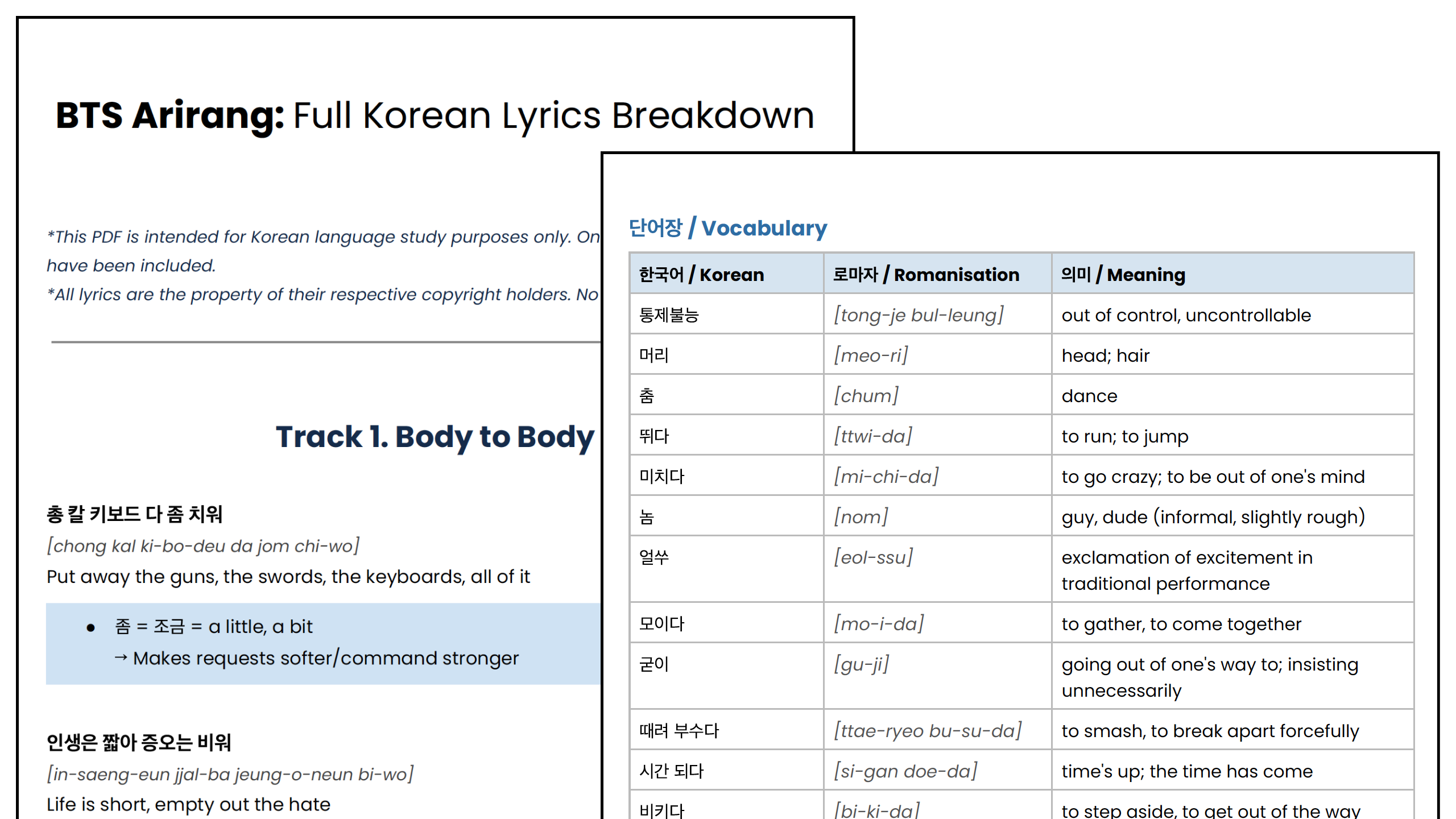Download the complete Korean lyrics from every track on BTS’s ARIRANG with English translations and vocabulary list!